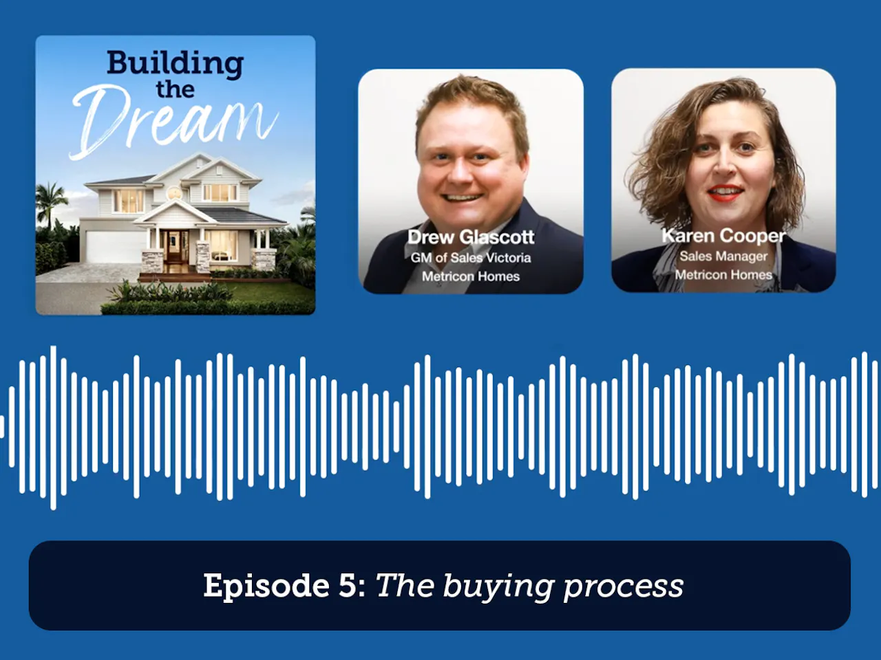 We're joined by two Metricon experts who’ve helped hundreds of new home builders throughout the buying process, Karen Cooper and Drew Glascott. Karen Cooper is a Sales Manager at Metricon, and she's been a part of the homebuilding industry for decades. Drew Glascott, who you may remember from our first episode, is the General Manager of Sales in Victoria for Metricon, and he's the perfect person to help us through these early stages of the process.