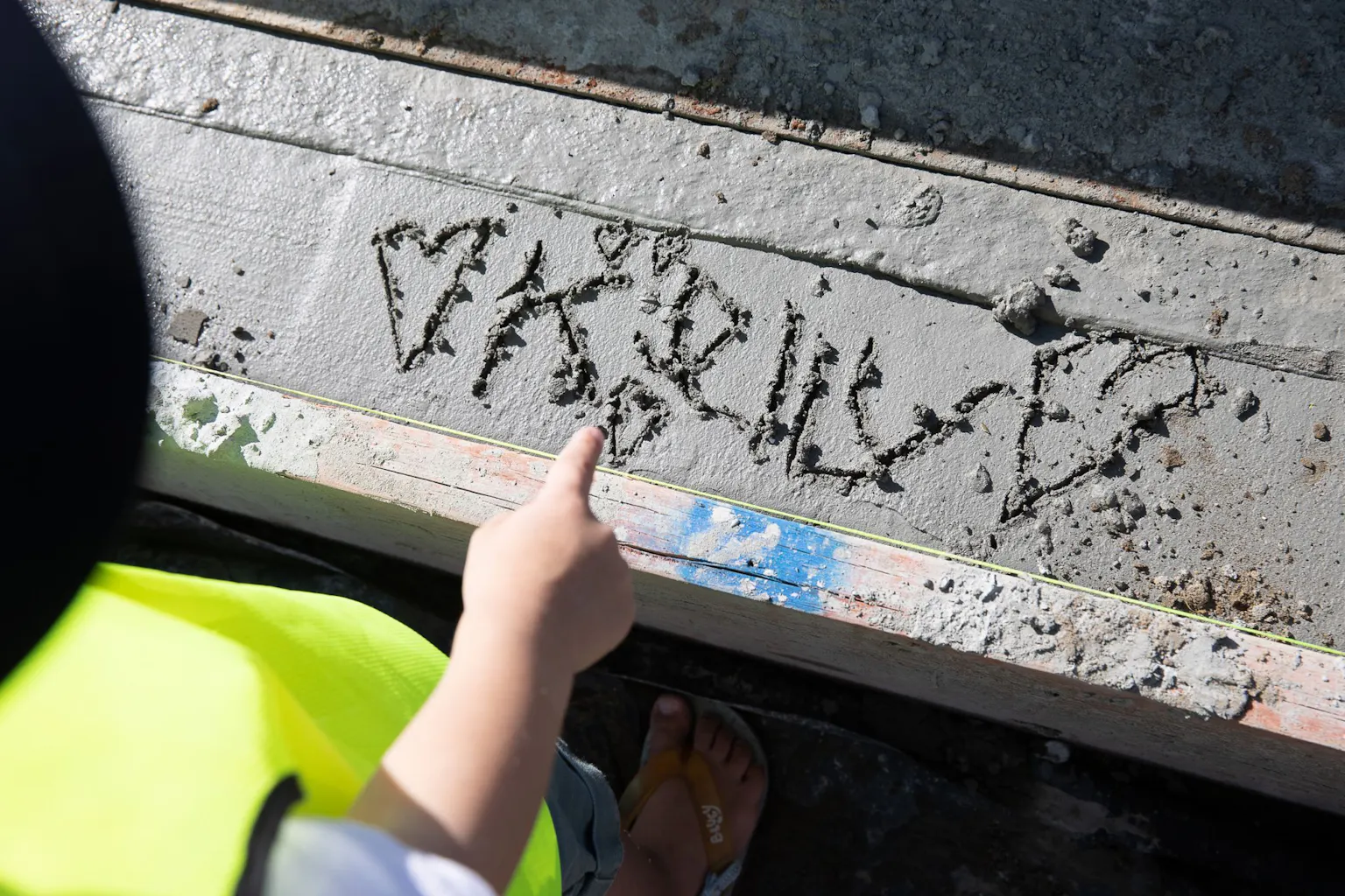 As a group they were able to celebrate the first milestone in the build of their customised Merricks 38 double-storey design – the slab pour. In a touching tribute to Kelly, the kids etched her name into the slab itself.