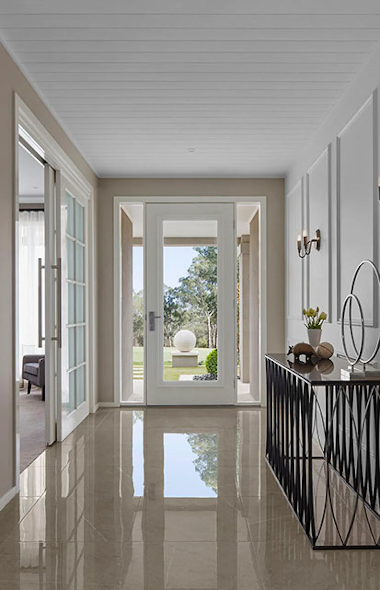 If you plan on painting your front door, look for entrance doors with a primed door skin, which creates a smooth surface suitable for painting. Or, if you're going for a more natural finish, high-quality solid timber doors and timber veneers are best stained. Make sure you research the styling qualities of your home - Hamptons front doors look very different to French Provincial entrance doors.
