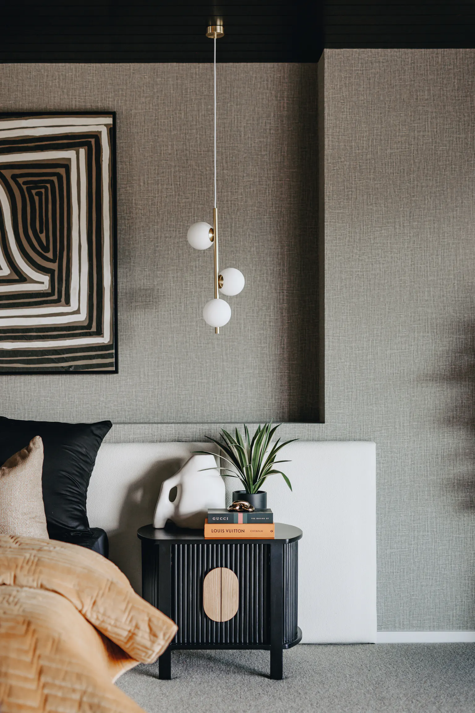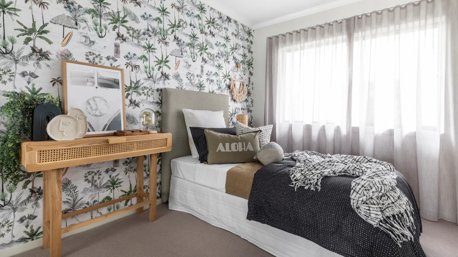 “I was working up in Queensland 20-odd years ago, and I remember I would struggle to get specialist painters in to achieve things like lime washes or other beautiful paint effects I was looking to achieve,” she says. “So I hit on the idea of jazzing up my feature walls with wallpaper that could replicate the same look.”