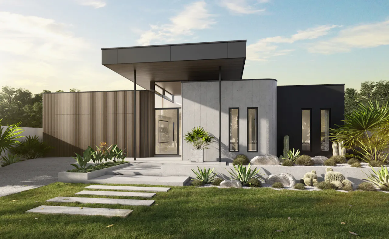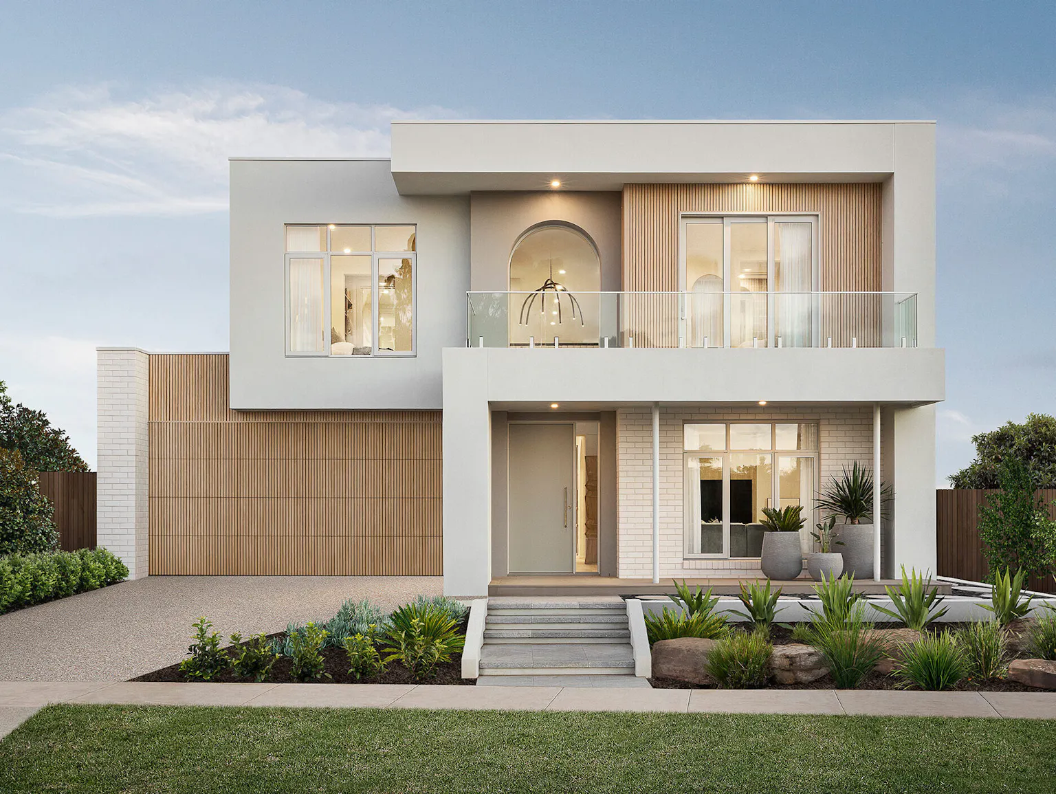 Inspired by Palm Springs-style architecture, the Las Palmas façade combines soft curves with clean-cut lines for a bold yet elegant presence. A stunning arched feature window is framed by a projecting hood, adding drama and dimension. Vertical timber accents, slender structural columns and a graceful first-floor balcony bring a lightness to the overall design, while concrete-look finishes ground the home with subtle strength. It’s stylish, confident, and effortlessly cool.