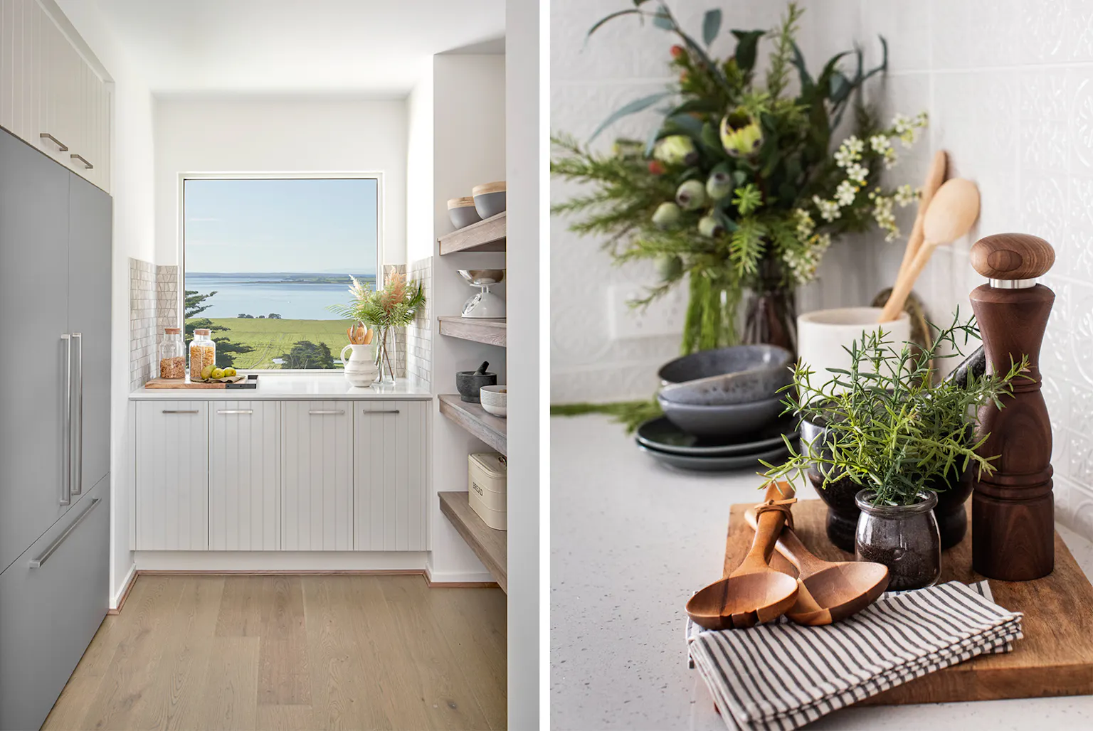 If you’re finding your butler’s pantry is on the smaller side, don’t be afraid to buy some contemporary or statement hooks and make a feature on a blank wall. Use woven or netted bags to store fruit or other supplies, or to store away grocery bags as they multiply notoriously. “Attach one sturdy bag to a hook and make sure you pop all the others inside it as soon as you’ve stacked your groceries,” Marissa says.