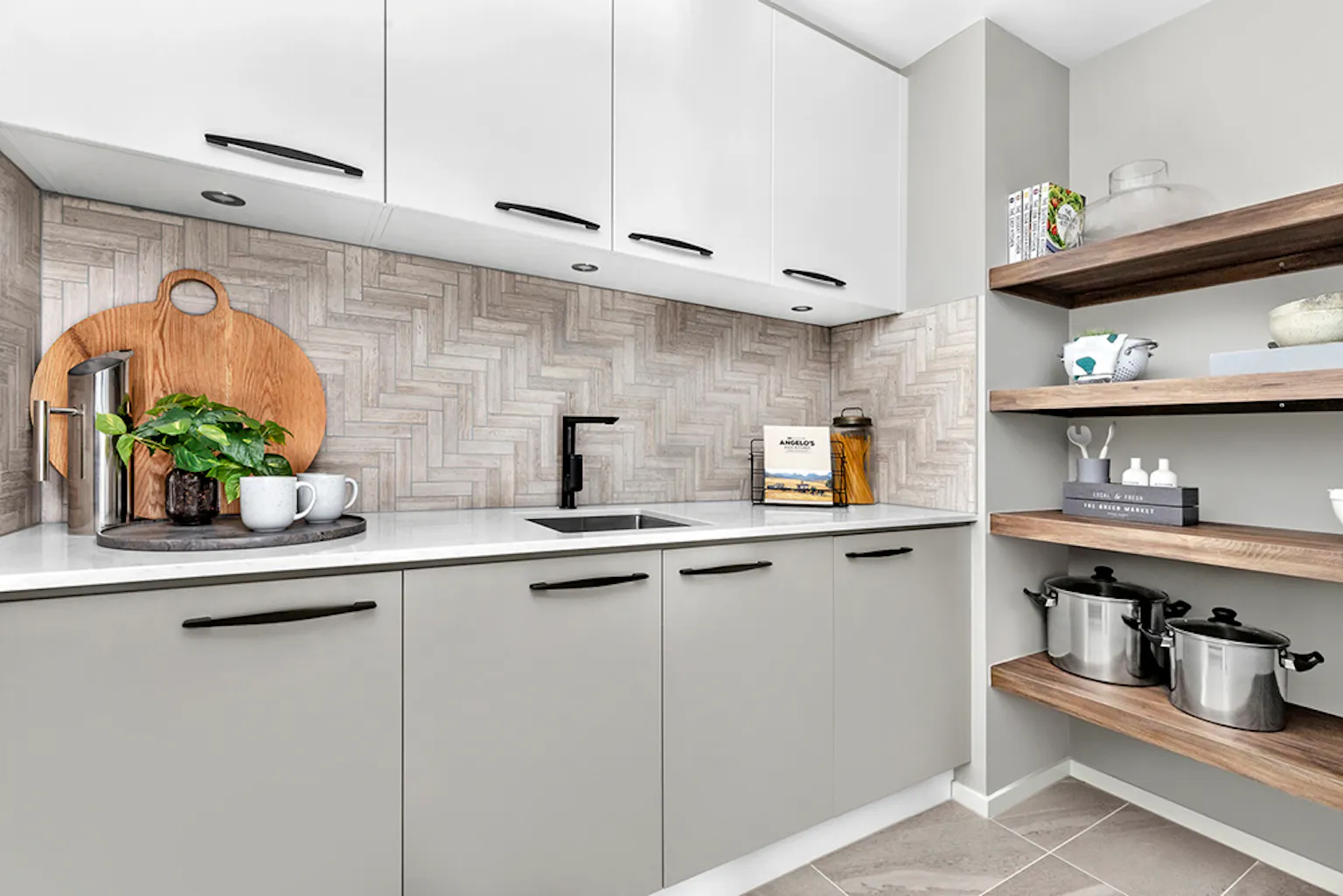 The most popular way to do this is having contrasting kitchen cabinets between upper and lower levels. For example, you can install a light wood grain up top, where you'd store glassware and dinnerware, and darker timber for cabinets under the bench where you'll store pots and pans. Going light up top is always the recommended look as it helps to ground the space.