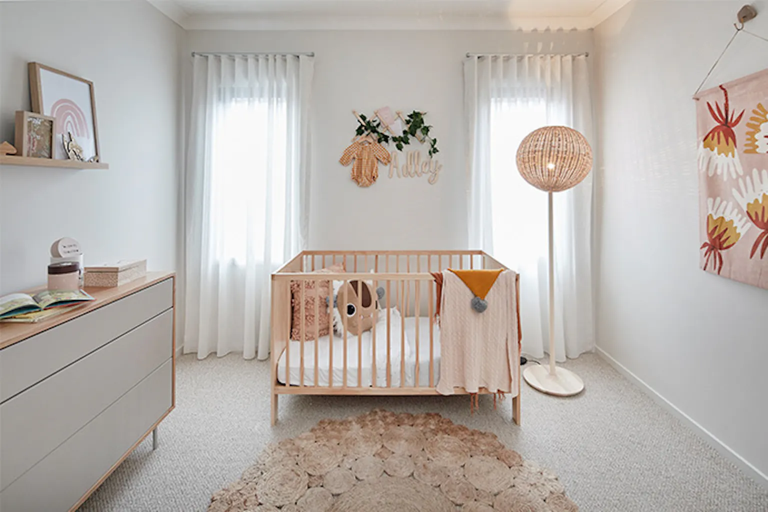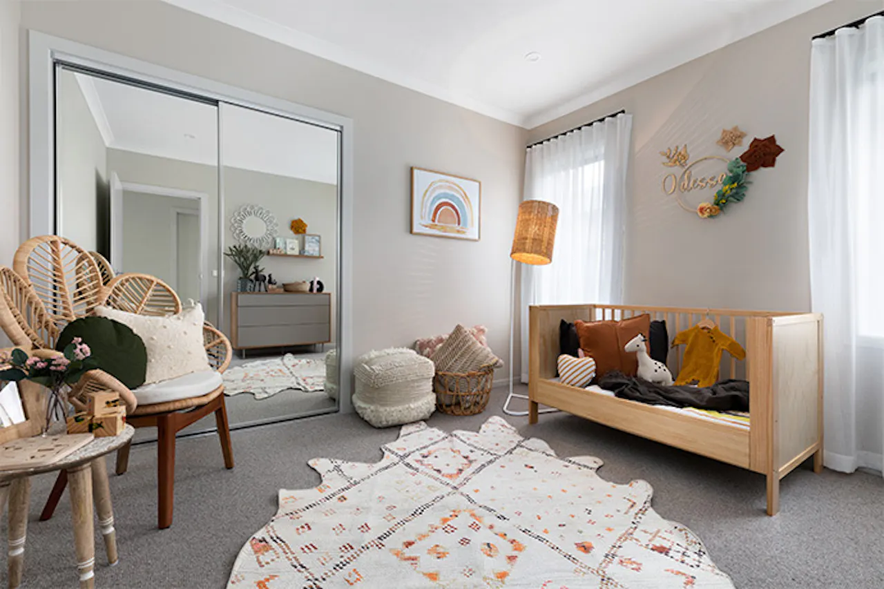 A good tip is to keep the basics simple, so opt for cream walls, wood tones on the crib and chest of drawers, and light-coloured carpets. Then introduce pops of colour in wall-hangings, art, throws, toys and gorgeous baby clothes. Raffia and cane are popular on-trend nursery inclusions and can be incorporated in floor rugs, lighting and seating. Don’t forget to include a comfy seat for night-time feeds and bedtime stories.