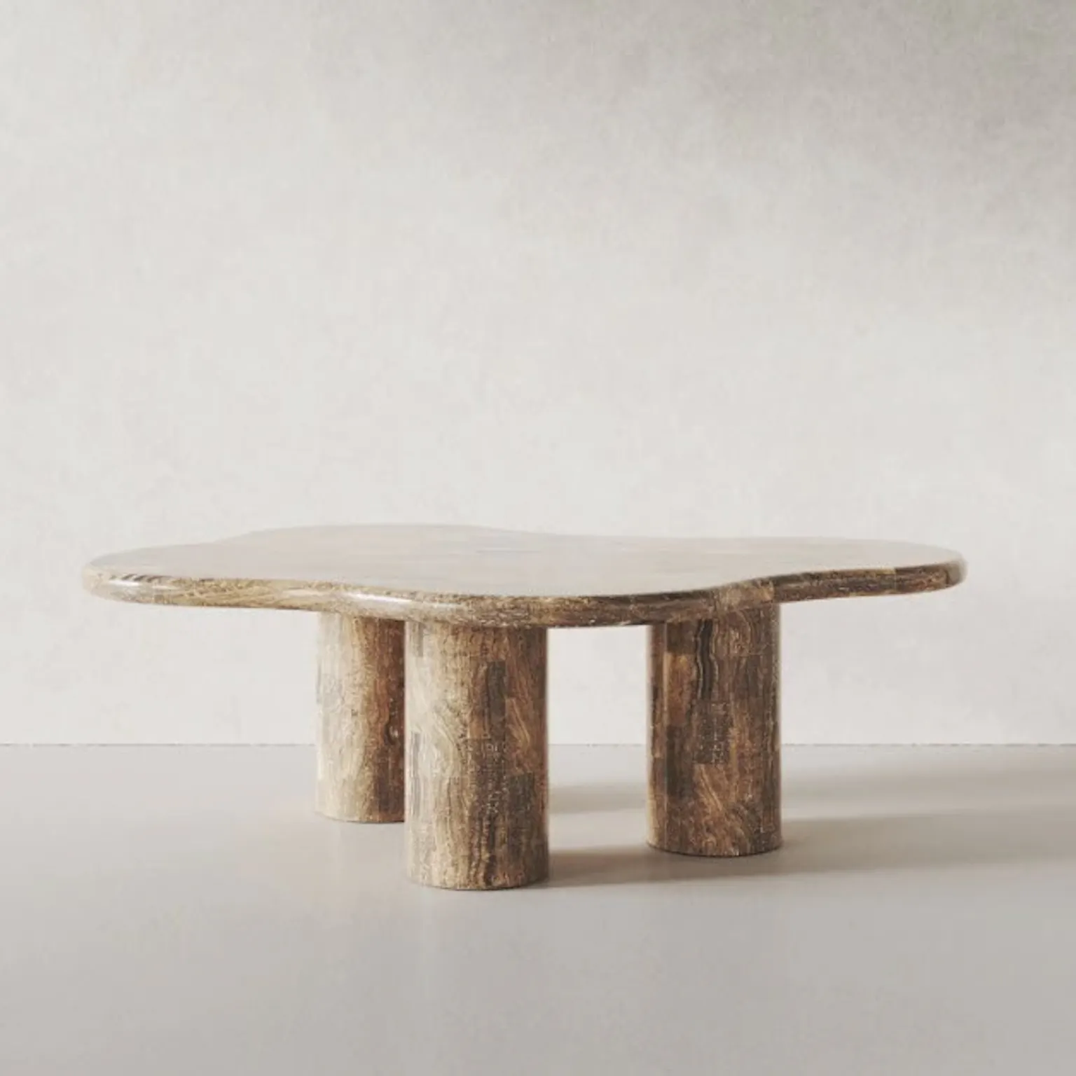Nature flows in the veins of this striking stone coffee table. Moreno stone emanates organic beauty and offers a sense of fluidity to the space. That unique feel carries through to the gracious curves of the work’s top and its pedestal legs.