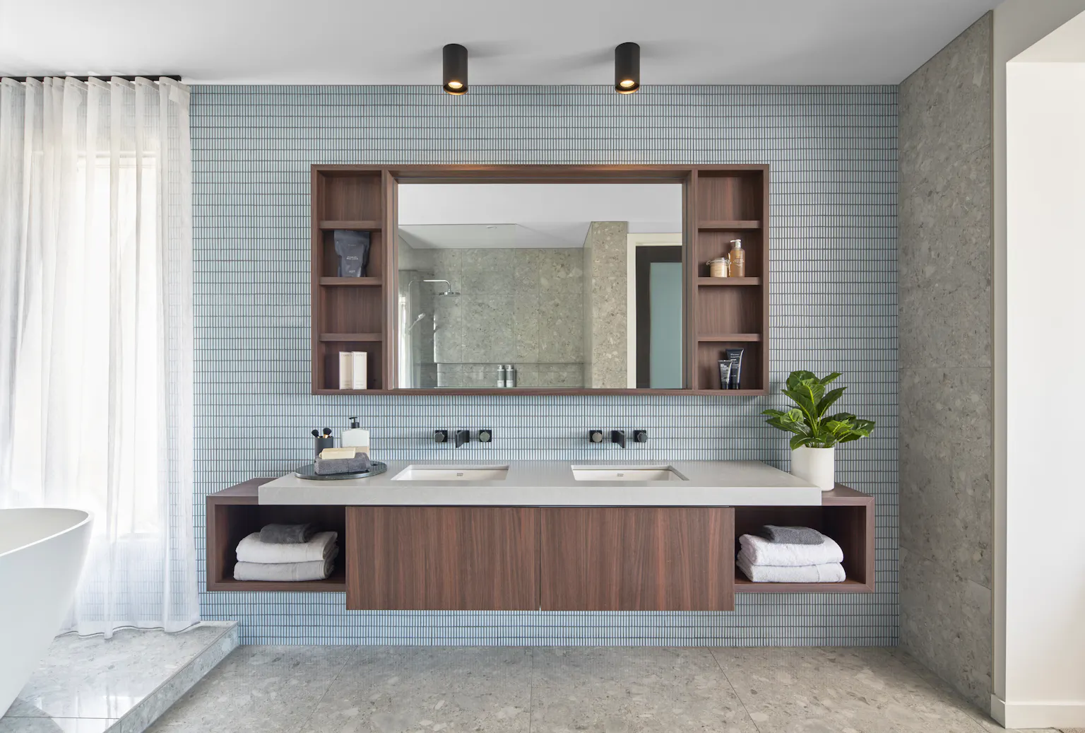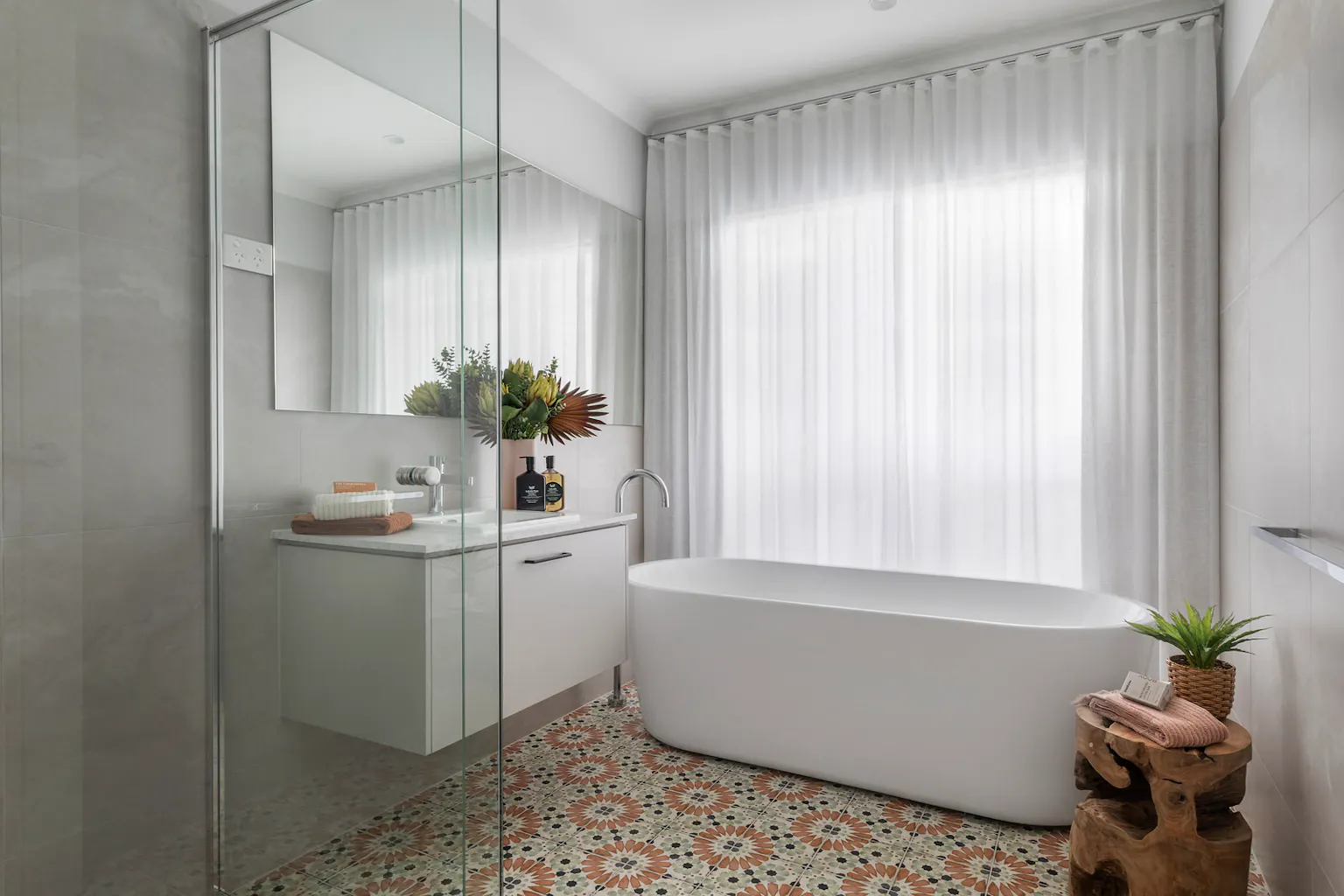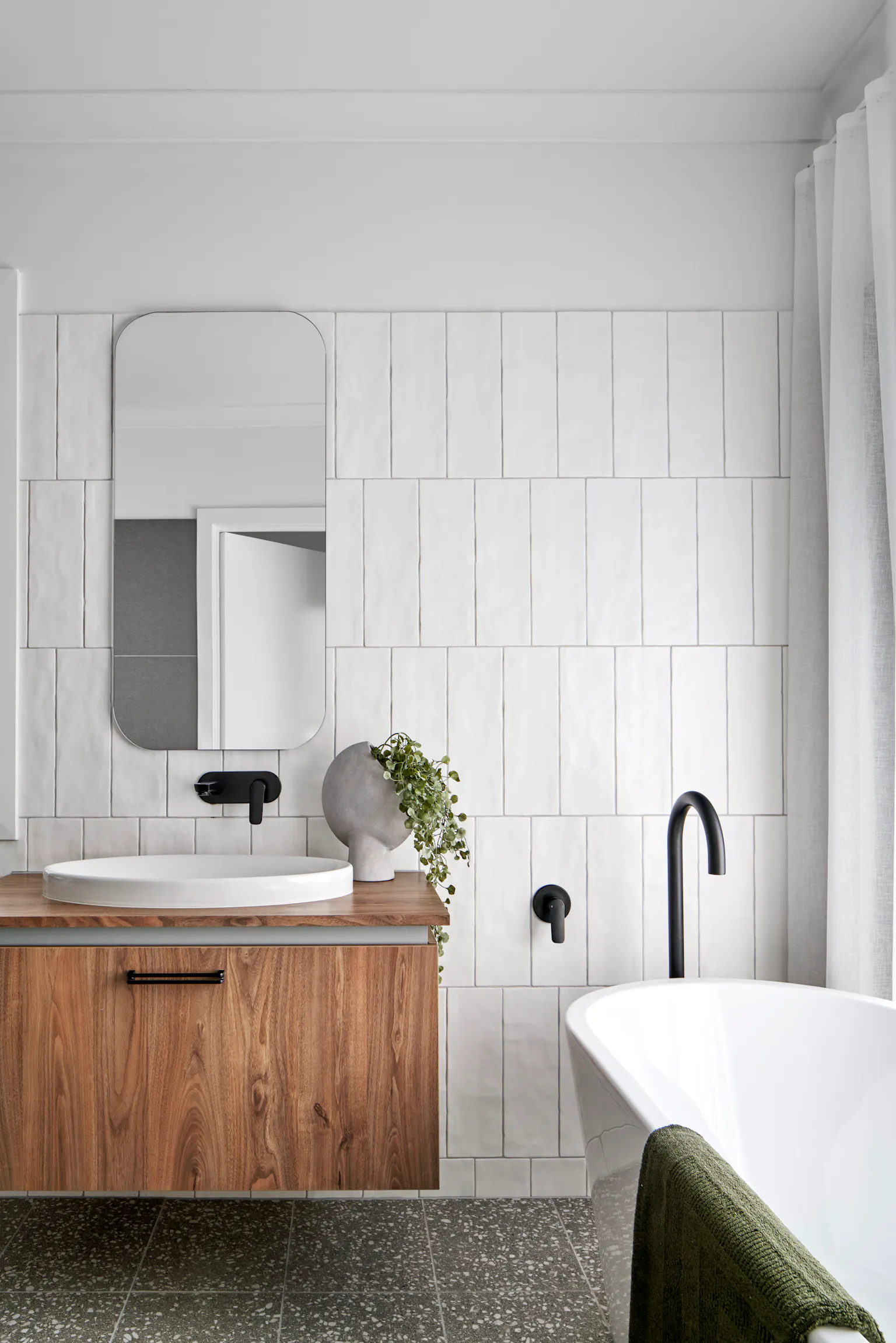 Kristina also suggests having a play around with geometric shapes and block-patterned tiles. “They’re really popular right now too and can be a bold choice when used on the floor or as a feature wall in your bathroom.”