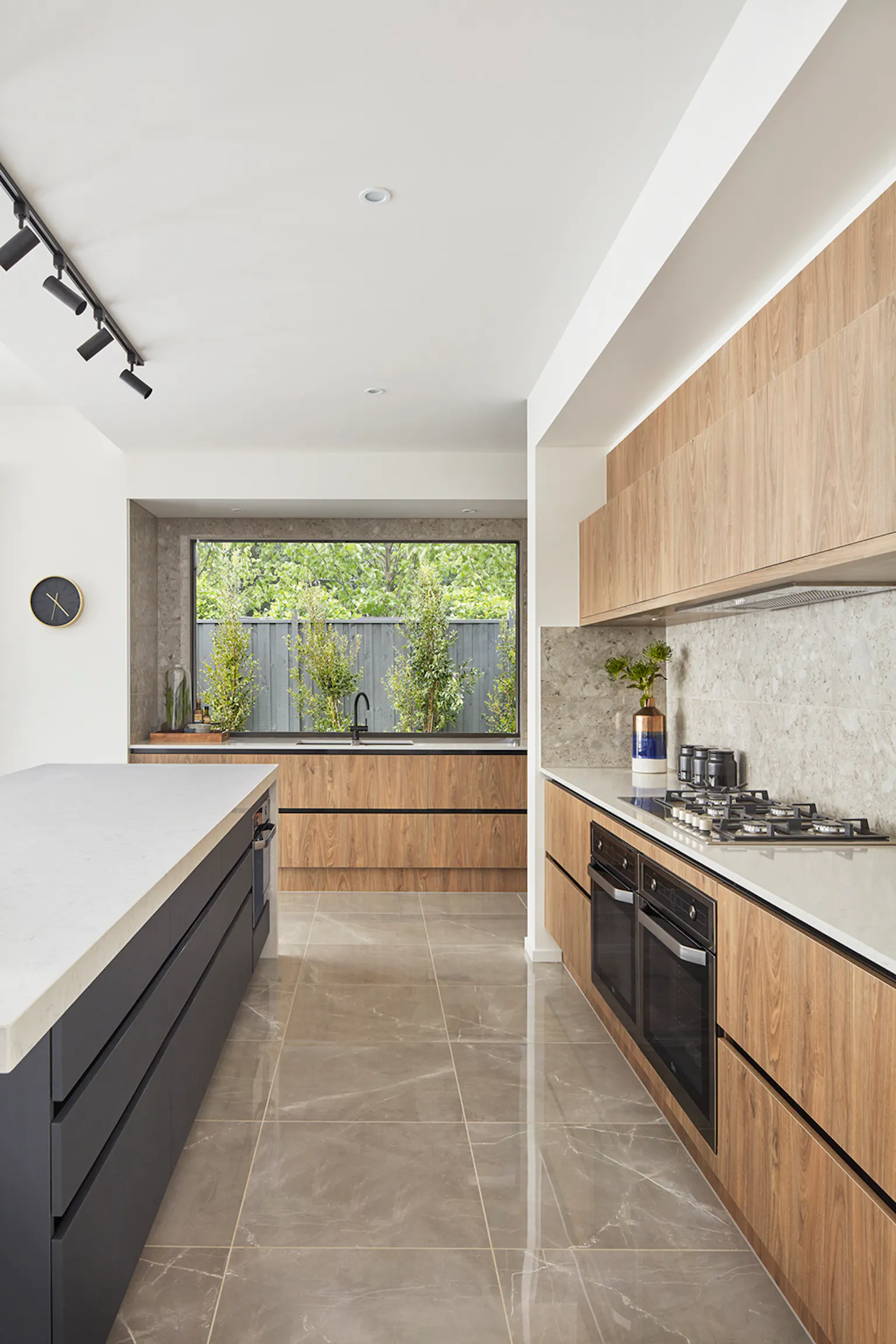 The island bench can transform from a place to prepare food to the focal point of the kitchen and dining space. To up the wow factor, pick out a stone-look finish benchtop and install pendant lights or track lighting.