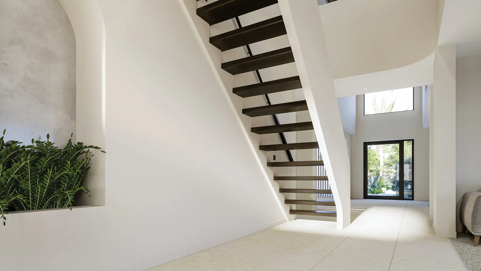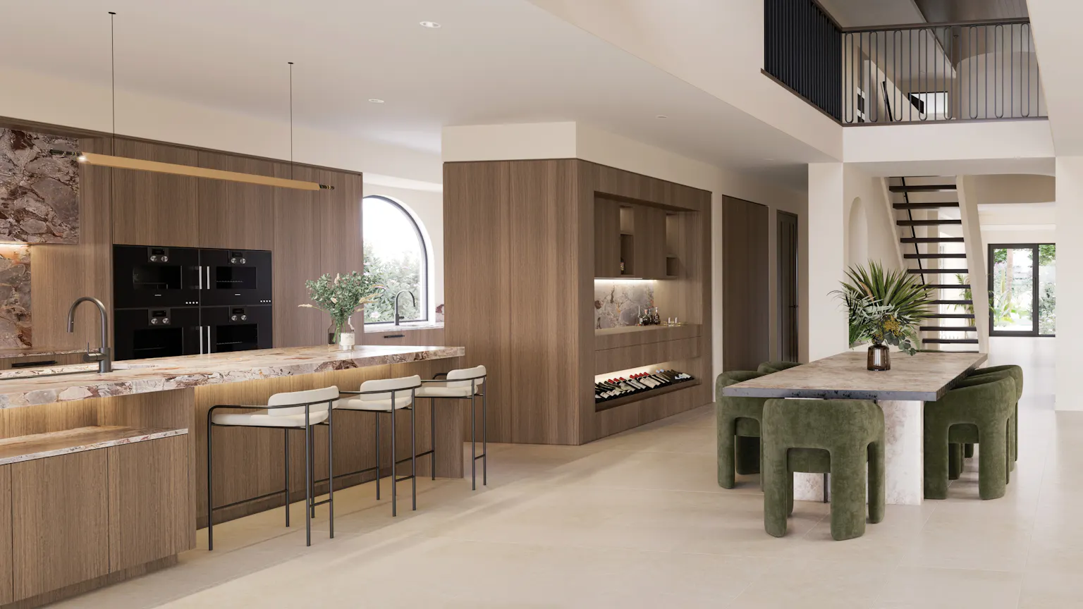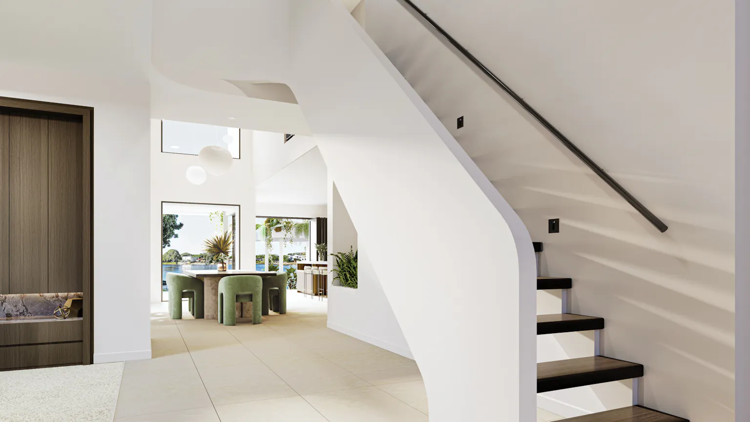 The Catalina elevates refined living across expansive, light-filled spaces that feel calm, open and beautifully connected. The ground floor reveals a generous entertainer’s kitchen with a large walk-in pantry, flowing seamlessly into the wide living and dining area that reaches toward the outdoor entertaining space and rear outlook. A private guest suite with a private ensuite is complemented by a dedicated study and home theatre, creating thoughtful places to retreat. Upstairs, the Main Bedroom becomes a beautifully appointed haven, joined by three additional bedrooms, each with their own walk-in robe and ensuite. Central voids draw light through both levels, lifting the atmosphere of everyday living. At the centre, the staircase rises with sculptural boldness, its curves echoing the arched windows and softly rounded walkways above, completing an atmosphere of refined artistry.