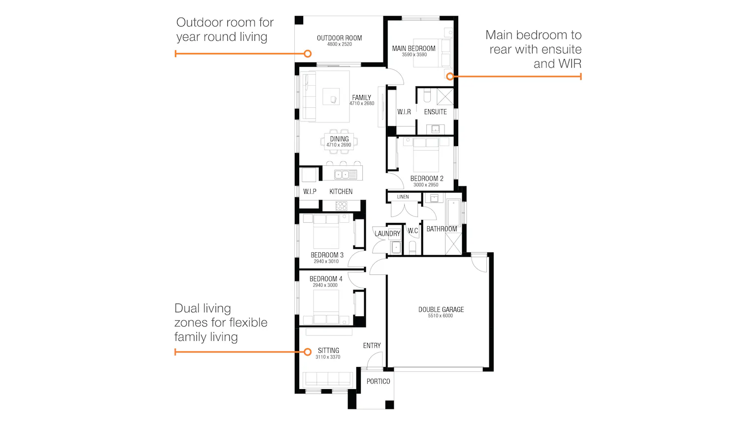 The Clara’s intelligent design pairs four bedrooms, two living spaces and an outdoor room creating room for the whole family. The main bedroom is located at the rear of the home while three additional bedrooms are grouped centrally. The kitchen includes a walk-in-pantry overlooking an adjoining dining and family room, perfectly located to the outdoor room making entertaining all year round a breeze.