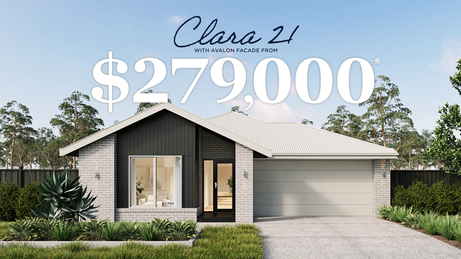 *Price based on the Clara 21 with Avalon façade in SA build region. Price excludes site costs and land. Image includes items not supplied by Metricon including landscaping, driveway and fencing and upgrade items.